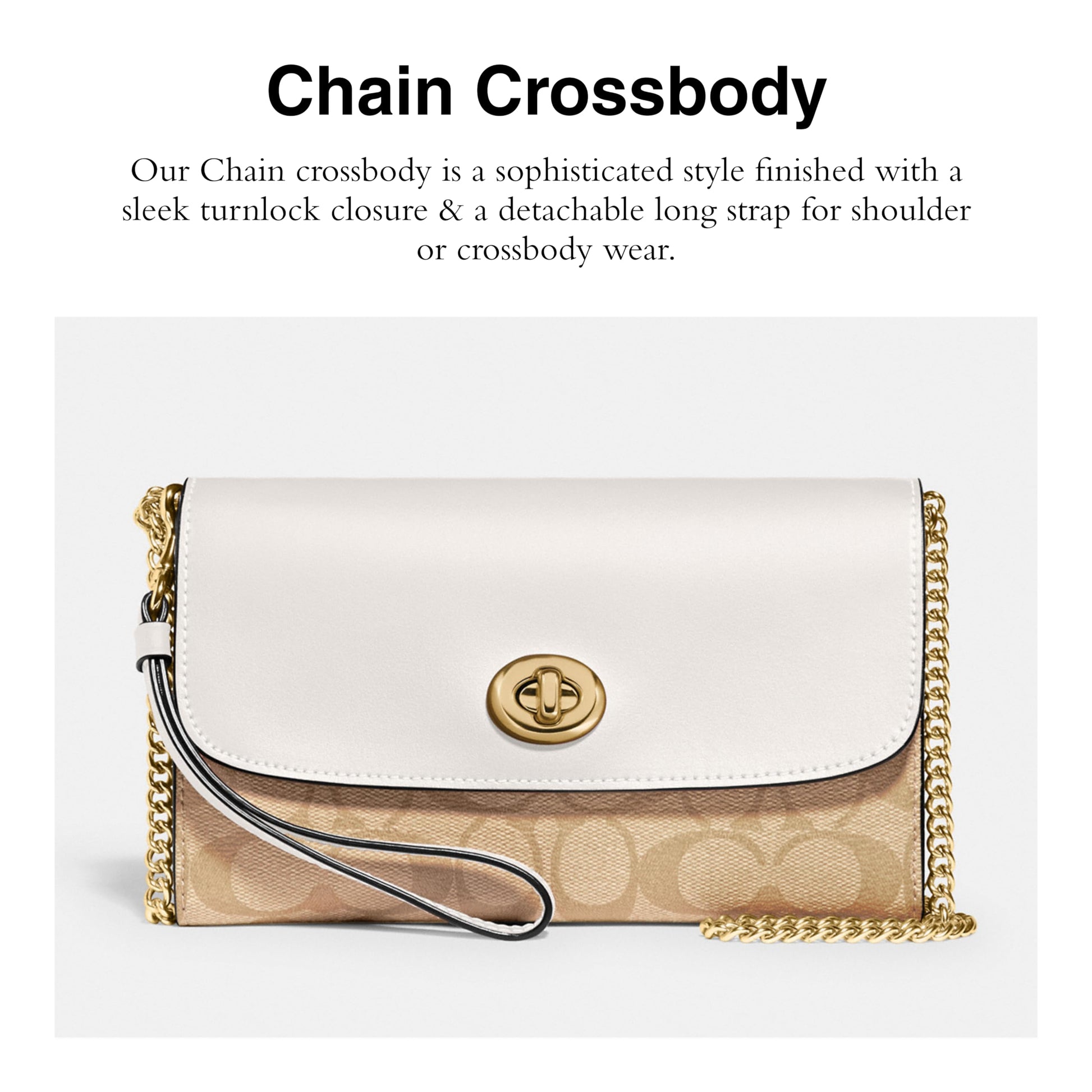 Editors Notes: Our Signature canvas and smooth leather Chain crossbody is a sophisticated style finished with a sleek turnlock closure & a detachable long strap for shoulder or crossbody wear
