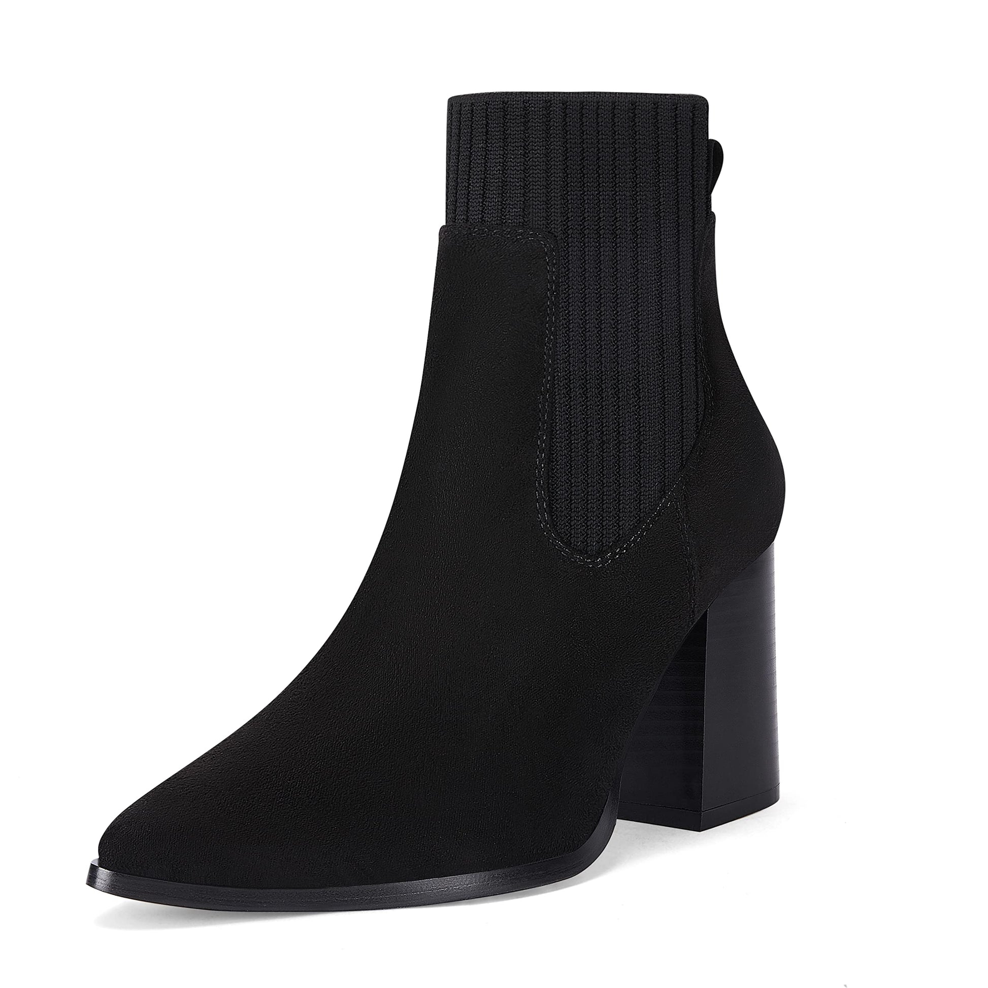 Women Pointed Toe Ankle Boots Knit Sock Boot Chunky Block Heel Chelsea Booties