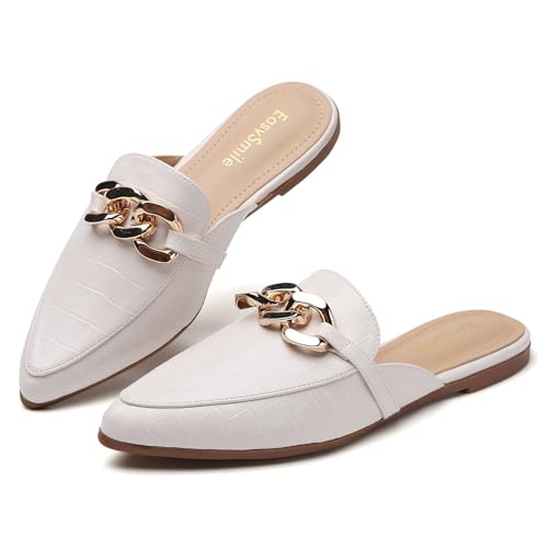 Metal Chain Decor Flat Mules for Women Closed Pointed Toe Slip on Loafers Slides Backless Mules Shoes