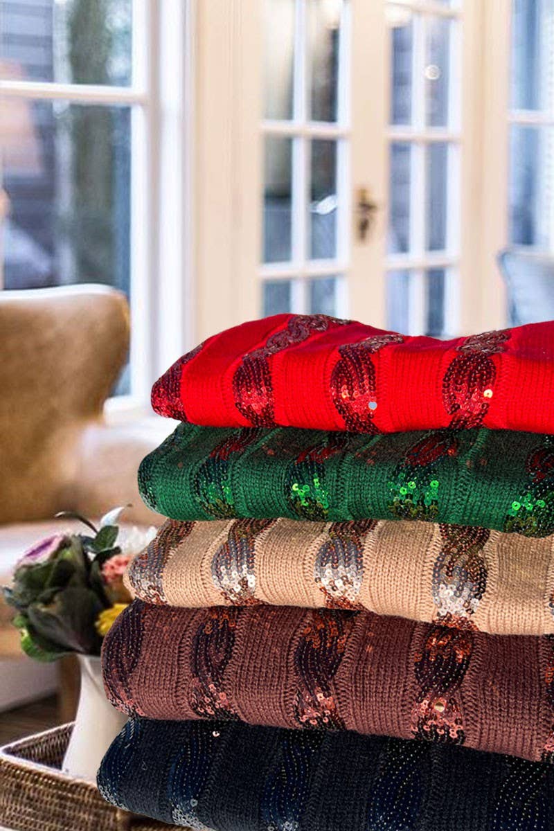 Vine & Love - Cable Sequin Detail Crew Neck Knitted Sweater Top VT70164