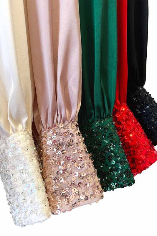 Vine & Love - Sequin Cuff Detail Boat Neck Satin Blouse Top VT81259